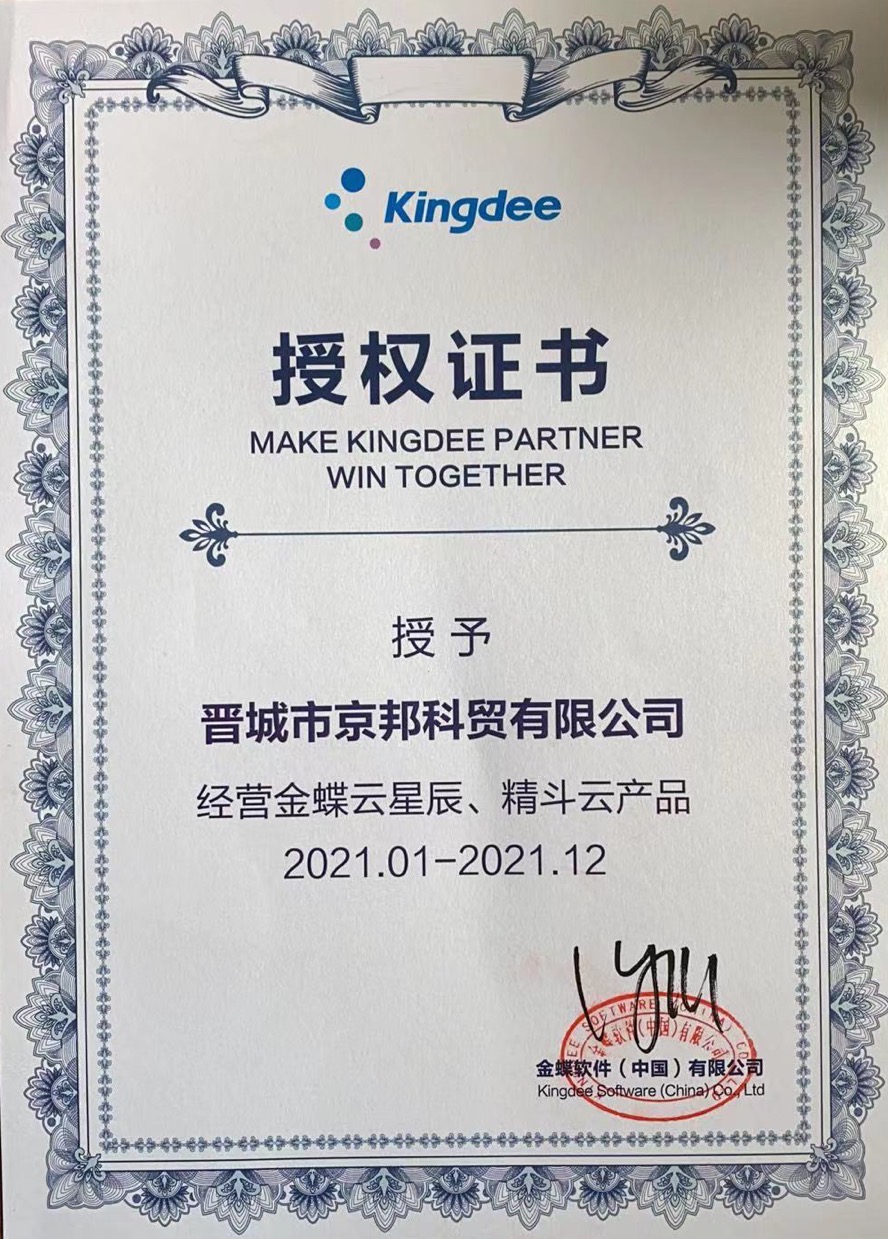 晉城市京邦科貿(mào)有限公司成立于2006年,是經(jīng)晉城市工商行政管理局登記注冊,主要從事軟件銷售、電腦銷售和企業(yè)管理咨詢等相關(guān)業(yè)務(wù),是金蝶軟件(中國)有限公司、深圳九明珠信息科技有限公司、深圳萬國思迅軟件有限公司在晉城地區(qū)高級代理商,主要代理金蝶